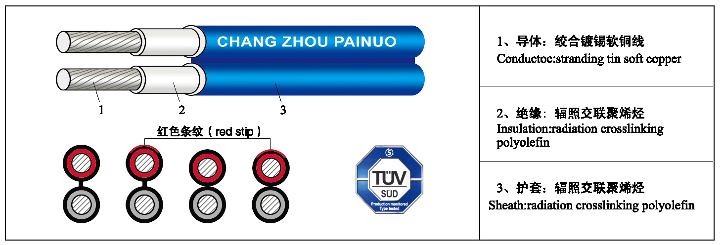 印字    MARKING   PV1-F 2*()mm2 CHANG ZHOU PAINUO ELECTRON CO.,LTD. TÜV SÜD approved VDE-AR-E 2283-4:2011-10  |